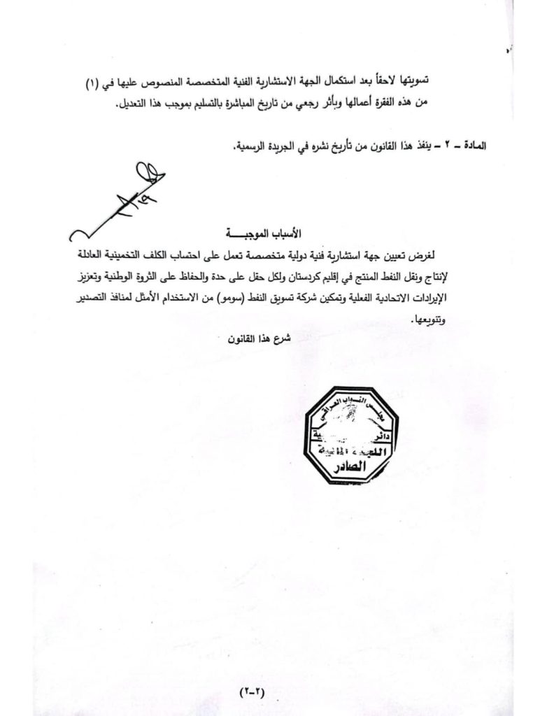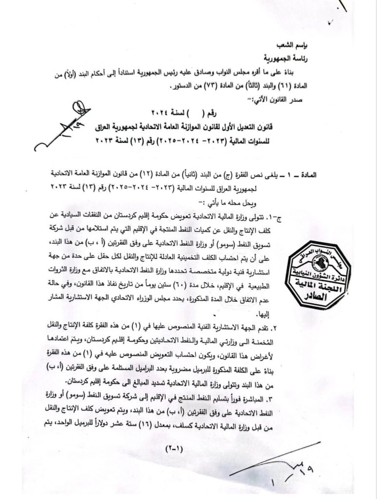 ئەنجومەنی نوێنەرانی عیراق هەمواری یاسای بودجەی گشتی عیراقی پەسەند كرد كە نرخی تێچوی بەرهەمهێنانی نەوتی تیادا جێگیر كرابو.